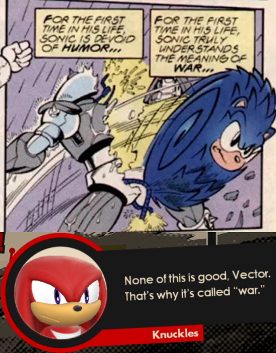 The story progression is bad and nonsensical, we're told a lot of stuff, like "Sonic's been tortured for months!" or "Tails has lost it," none of which ended up being true or relevant. The dialogue is also really really corny and bad. Have you ever seen that Archie Sonic meme of "Sonic learned the true meaning of war"? Well, they made it into a canonical line of dialogue, played completely straight. Ho-ly SHIT.